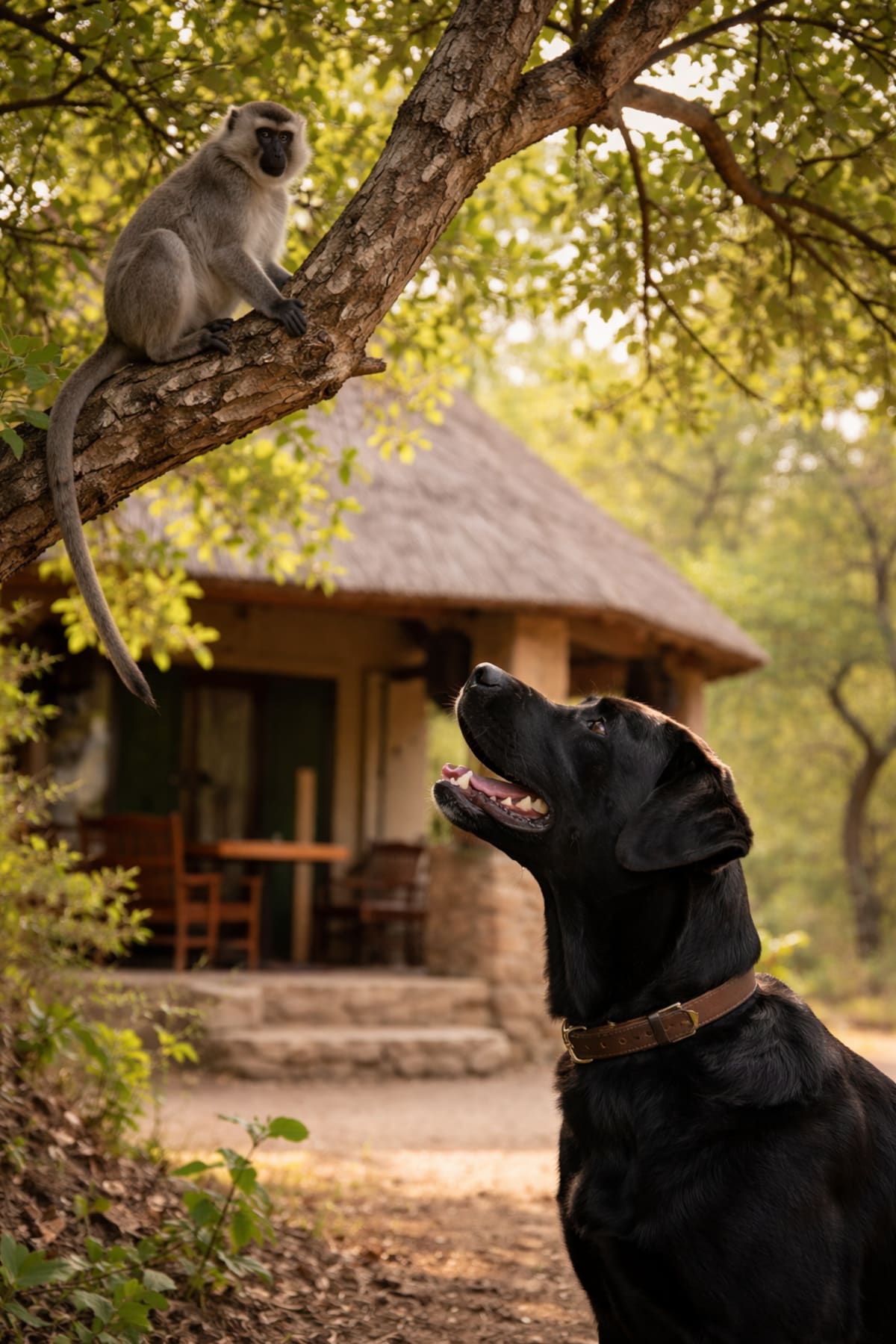 And then, chaos arrived. There was a sudden thud in the tree right next to the bungalow. A grey blur landed on a branch, a real, live vervet monkey, bold as brass and clearly unconcerned about trespassing onto Bella’s territory.