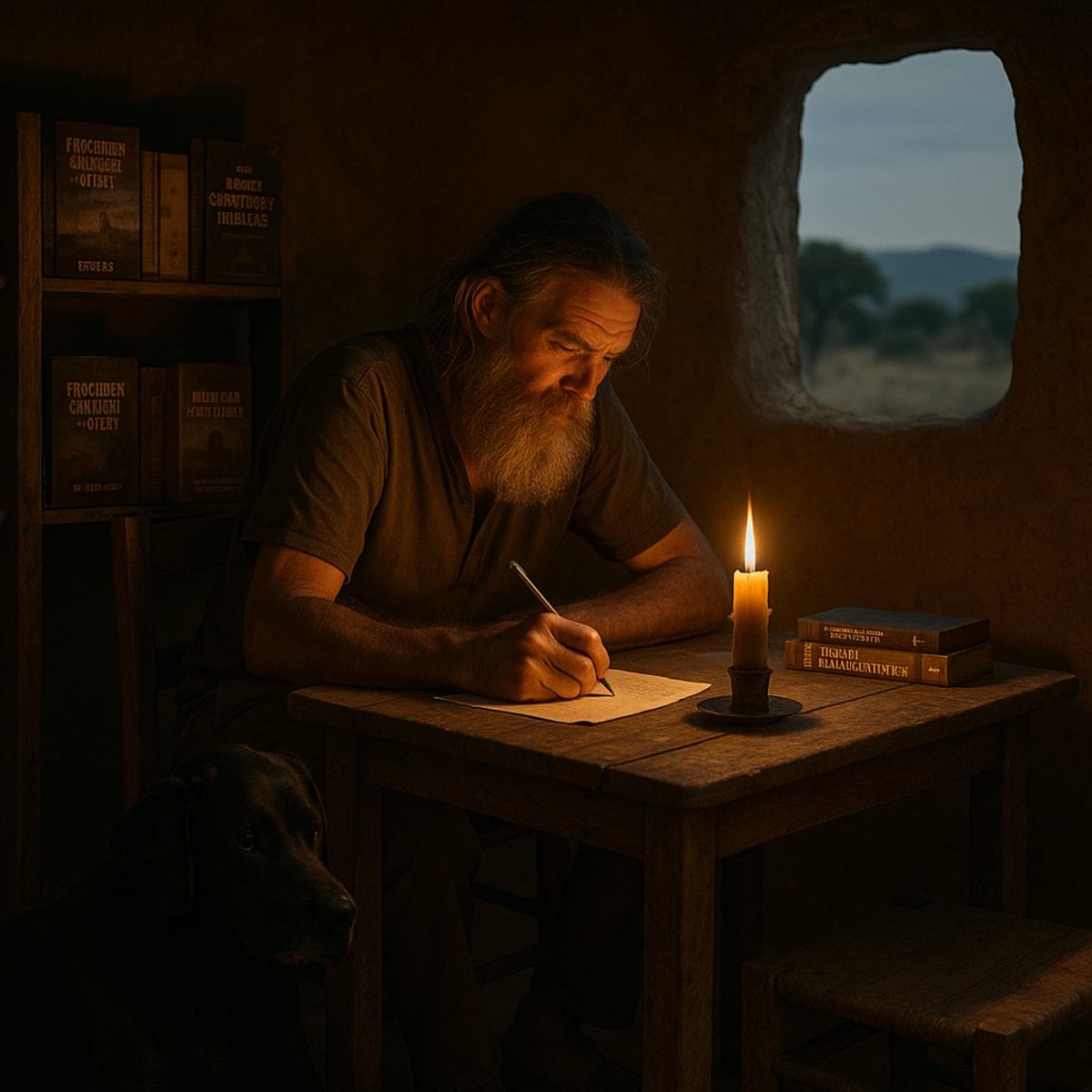 He insists he writes the pure way. Only a pencil and paper. Only by candlelight, and not a store-bought candle, mind you, but one he made himself from goat fat. His bungalow has no glass windows (too modern), just a hole in the mud wall. When the wind blows through, he nods wisely: “The wind must taste my words before any reader does.”